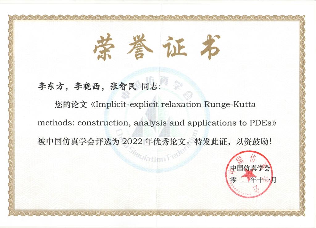 1月6日至8日,第三十四届中国仿真大会暨第二十一届亚洲仿真会议在湖南长沙召开,李东方教授团队成果“隐显松弛龙塔库塔方法:构造、分析和在偏微分方程中的应用”获2022年度中国仿真学会优秀论文。该奖项是中国仿真学会论文领域的最高奖项。
