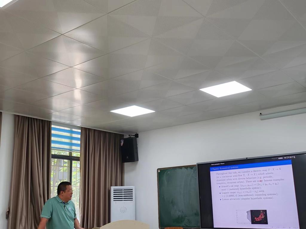 李东方老师在报告中,结合松弛思想和高阶线性化技术,构造了一些列线性化隐式保结构算法,主要包括线松弛隐显式龙格库塔算法,松弛外推龙格算法,松弛指数算法等。系统的研究了算法的长时间动力学性质,获得了算法稳定性和相容阶等。并将算法成功的应用到高振荡哈密尔系统,相场模型,复杂耦合流体模型等典型问题的仿真中。数值实验显示,新算法在达到高精度和保结构性质的同时,大大提高了系统仿真效率。张一威老师主要介绍了现代动力系统光滑遍历理论,重点介绍了该理论中遍历优化,热力学机制和重分形分解三个主题之间的相互联系。最后简单介绍了遍历优化主题中的通有周期最优化猜想的一些最新进展以及自己与其合作者的相关工作。