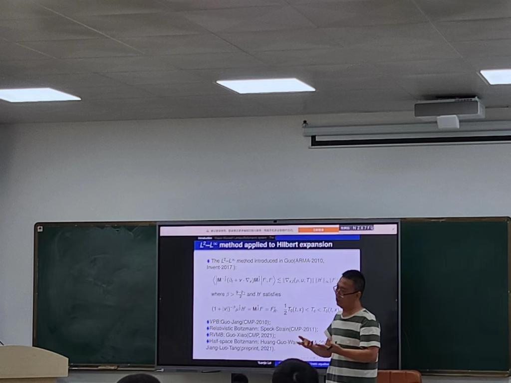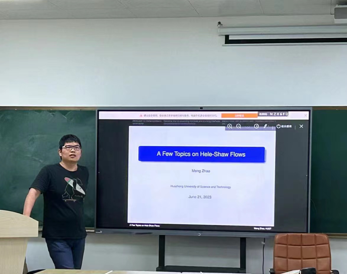 雷远杰老师主要讲述了朗道型和非角截断玻尔兹曼型动理学方程(组)关于希尔伯特展开的结果,包括从朗道(玻尔兹曼)方程到可压缩欧拉方程组的流体动力学极限,以及从弗拉索夫-麦克斯韦-朗道(玻尔兹曼)系统到欧拉-麦克斯韦方程系统的流体动力学极限。赵蒙老师介绍了一种研究移动界面问题中的界面不稳定性的高效自适应缩放算法。这种缩放的思想是将现有的时空映射到一个新的时空,并使得界面在新时空下以任意选定的速度演化。以Hele-Shaw问题为例,将该算法应用于多种不同的物理状况。