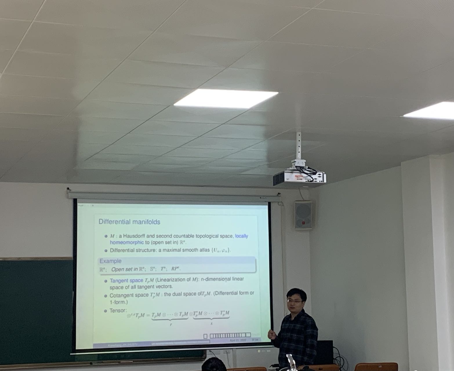 靳晓尚老师从黎曼几何与共形几何的基本概念出发,比较了这两种几何的研究,并以标准球面上的共形结构为例,引入了一般共形紧流形对应的Ambient space和渐近双曲流形的概念,最后介绍了目前关于渐近双曲流形的一些最新的进展和未解决的问题。向茂松老师简要回顾了Fedosov关于辛流形的形变量子化的几何构造和Kontsevich关于Poisson流形的形变量子化的思想;接着介绍了他们的方法在微分分次几何中的推广;最后尝试从物理的BV量子化的角度来理解这些构造,并提出了一些正在研究的感兴趣的问题,比如微分分次几何中的椭圆亏格,特别Witten亏格能告诉我们什么样的数学不变量。