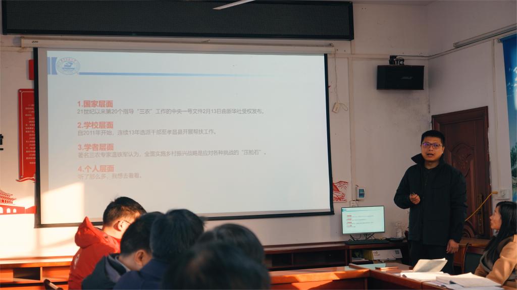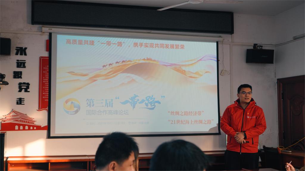 湖北省教育系统“学习二十大 师生进基层”巡讲队员、支部党员赵毅炜同志以《一带繁花一路歌》为题,领学习近平总书记在第三届“一带一路”国际合作高峰论坛开幕式上的主旨演讲精神。他介绍了一带一路提出的经济背景及古丝绸之路对此倡议的启发,并讲述了“五通”是助力“一带一路”高质量发展的必要途径,中国始终保持着和平合作、开放包容、互学互鉴、互利共赢的宗旨。