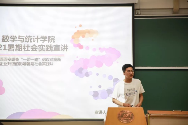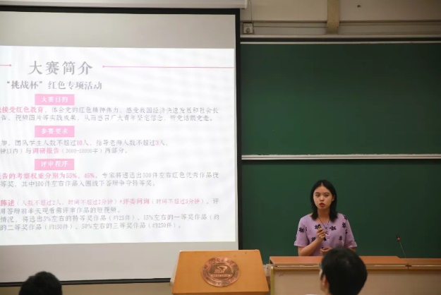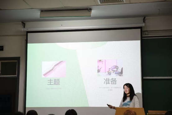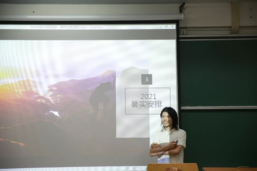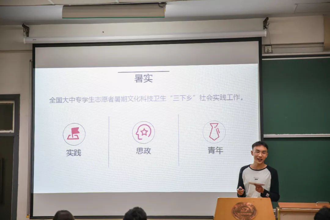 首先由社会实践部成员杨肖然对暑期社会实践进行介绍。杨肖然从非旅游性等特点出发,以通俗有趣的言语对暑期社会实践进行了简单描述,并介绍了暑实的分类。
