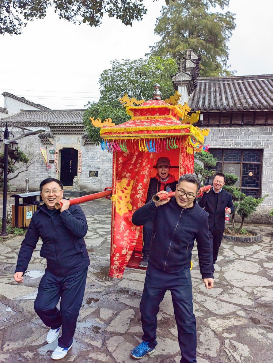 20多位教职工乘坐旅游大巴从公司出发,一路笑语欢声经过四十多分钟就来到景区。首先游览的是李庄古建筑博物馆。它是一个古建筑民俗文化村落,庄内展示了异地修复复原的明代官厅、清代官宅、小官宅、民宅、书院、绣楼、徽派小民宅、门楼、古牌楼、土地庙、徽派官宅、民国早期古戏台及古建文化街等24处景点。庄内摆放的花轿、龙灯,勾起了儿时的回忆,老师们不禁兴致昂然地玩起了抬花轿、舞龙灯。