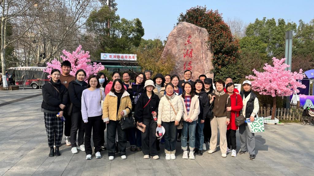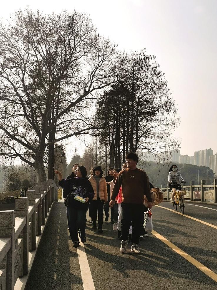 三月的东湖,春意盎然,湖光水色,风景靓丽。老师们在东湖楚风园集合拍照合影后就分两条线路行走,一条路线从东湖楚风园步行至磨山北门,另一条从楚风园码头乘坐游船至梅园码头,爬山到磨山北门。两条线路老师会合后一起沿东湖绿道继续前行返校。