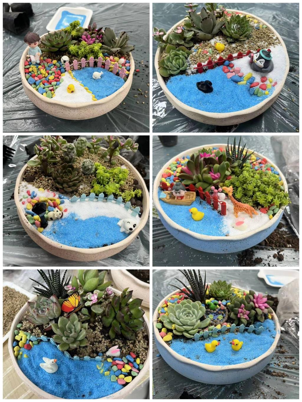 活动伊始,花艺师为大家讲解了多肉植物的特性、分享了栽培养护知识以及盆栽DIY的步骤和技巧,在掌握了基本知识后,大家迫不及待地投入了这场创意与自然地对话中,开始了DIY之旅。老师们手持工具饶有趣味地制作起来:小心翼翼地取出多肉,确定位置,扎根、填土、再进行装饰点缀……每个人都化身为巧手花匠,展示出丰富的创造力,打造着独具特色的“纯手工盆景”,展现出不同的艺术之美,有的清新文雅,有的呆萌可爱,每个作品都透露出生机勃勃。大家相互展示各自的作品,交流创作心得,在欢声笑语中,本次活动画上了圆满的句号。
