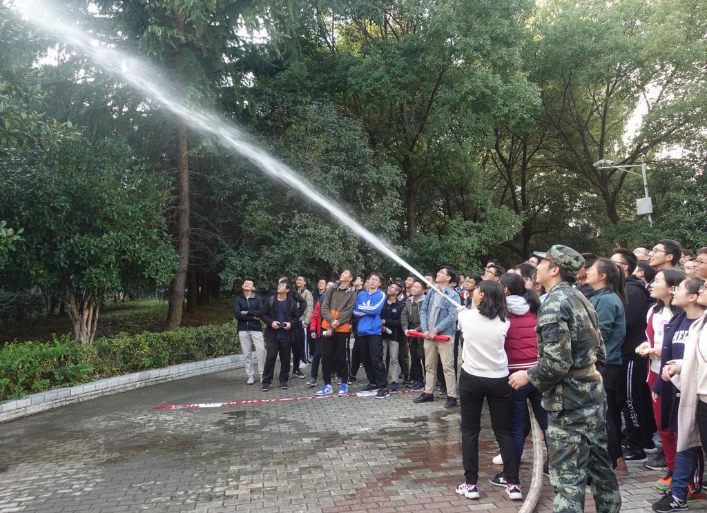 本次消防演习分为两个环节。第一个环节是模拟火灾逃生演练,以紫菘6栋作为模拟封闭“火灾现场”。“火灾现场”光线昏暗,刺鼻的烟雾(用烟雾弹模拟火灾烟雾)把人熏得晕头转向,分不清方向,大家立刻紧张起来进入状态,用湿毛巾捂住口鼻,迅速而有序的逃离了“火灾现场”。在第一个环节结束后,同学们来到小广场进行第二个环节:消防工具使用教学。在场老师首先指出了同学们逃生行动中的一些不足,耐心地讲解了正确的做法,随后开始教大家如何使用消防水枪和灭火器,老师们鼓励同学们亲身尝试,让同学们在实践中掌握了技巧。