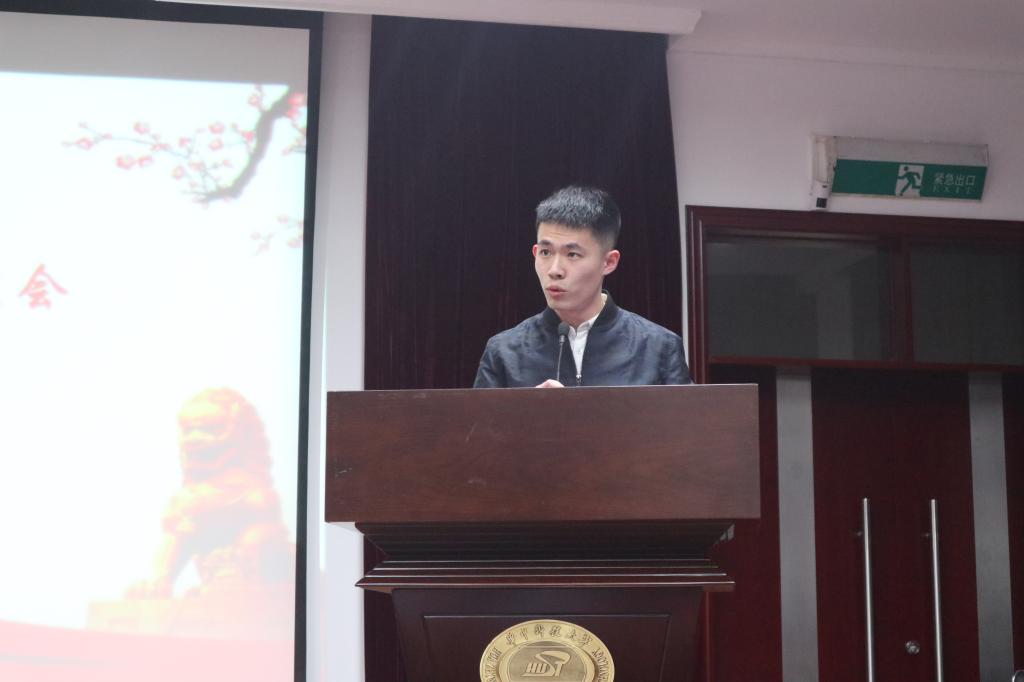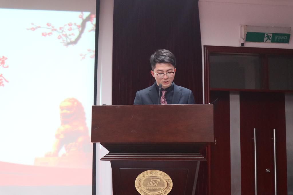 分团委书记万清昱首先致辞,将员工会和全院广大同学用“舟”和“水”作比,用“水能载舟”、“顺水行舟”、“一衣带水,风雨同舟”和“中流击水,浪遏飞舟”四句话概括了员工会围绕同学、团结同学、服务同学的宗旨与理念,对卸任的第十七届主席团和部长们表达了感谢,同时希望第十八届主席团的同学们能选好方向把稳舵,不断传承,带着员工会这艘大船驶向更加美好的未来。