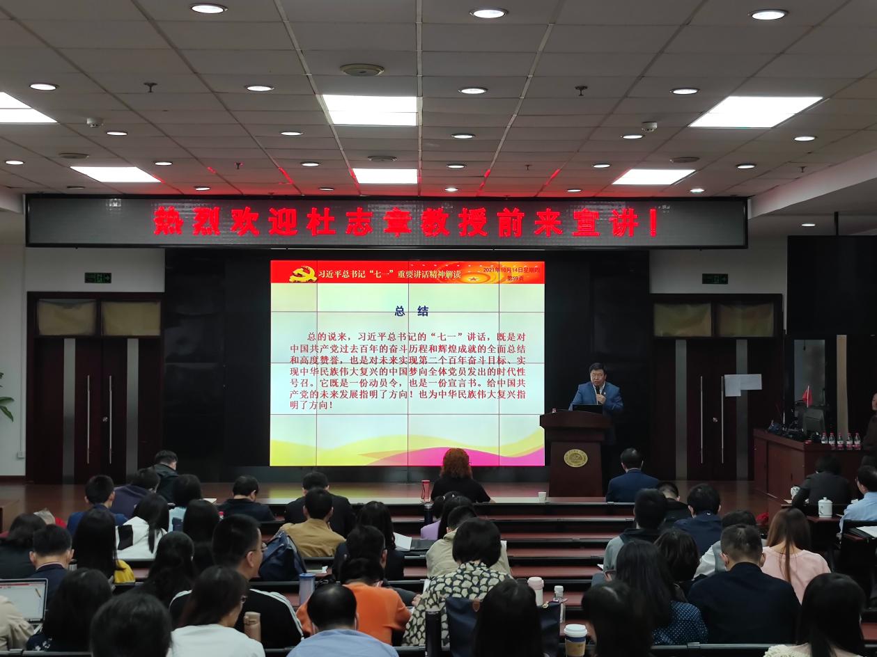 杜志章以“以史为鉴、开创未来”为题,全面阐述了习近平总书记“七一”重要讲话的重大意义、全面建成小康社会的历史性成就、党团结带领人民不懈奋斗的光辉历程、伟大建党精神的深刻内涵和时代价值、以史为鉴开创未来的根本要求和党中央发出的伟大号召。报告主题鲜明,脉络清晰,详尽的史实、真实的经历等接地气的宣讲方式,给在座党员以精神洗礼,对深入理解习近平总书记“七一”重要讲话精神具有重要的指导意义和推动作用。